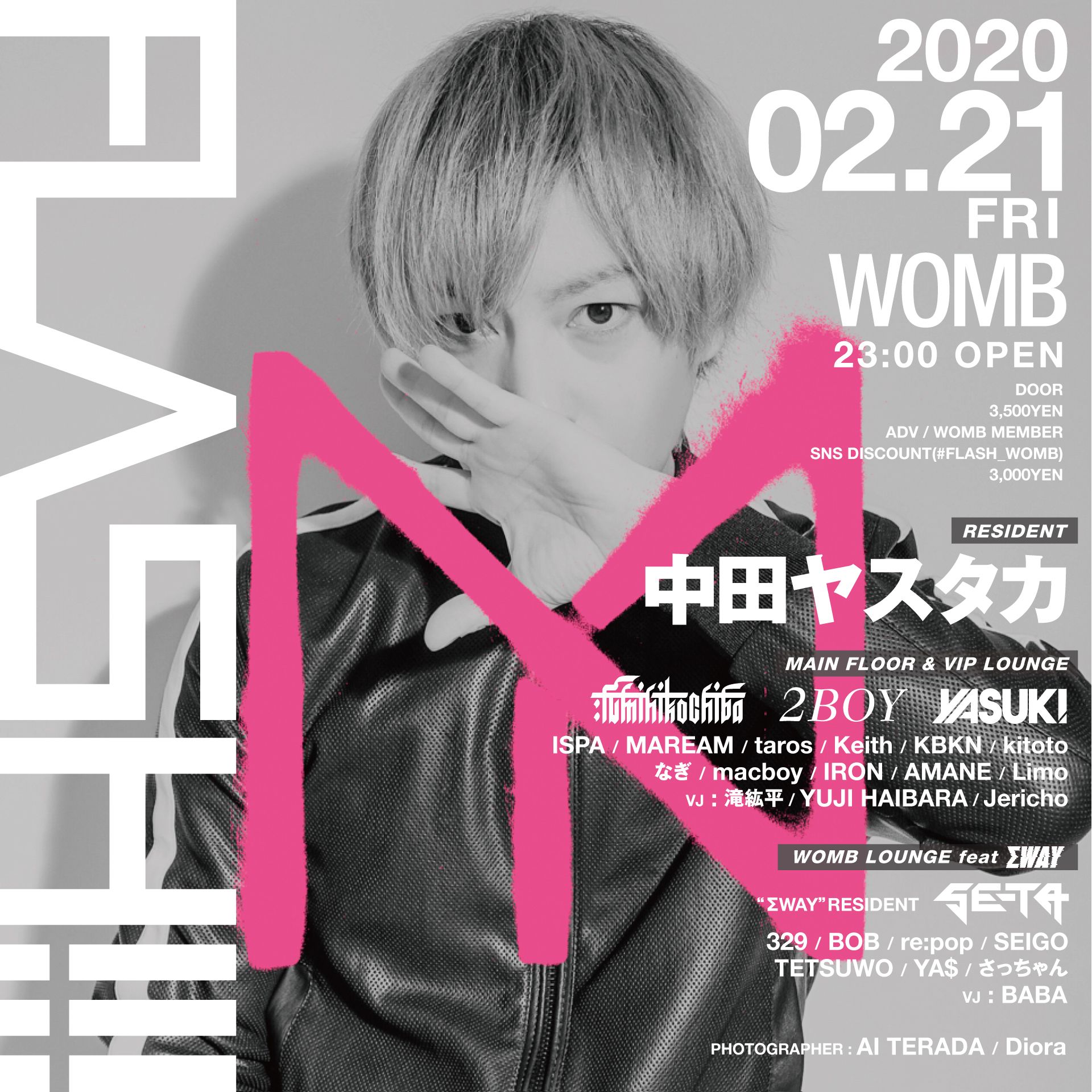 - DOOR: ¥3500 MEMBER: ¥3000 前売り: ¥3000 SNS DISCOUNT(#FLASH_WOMB): ¥3000