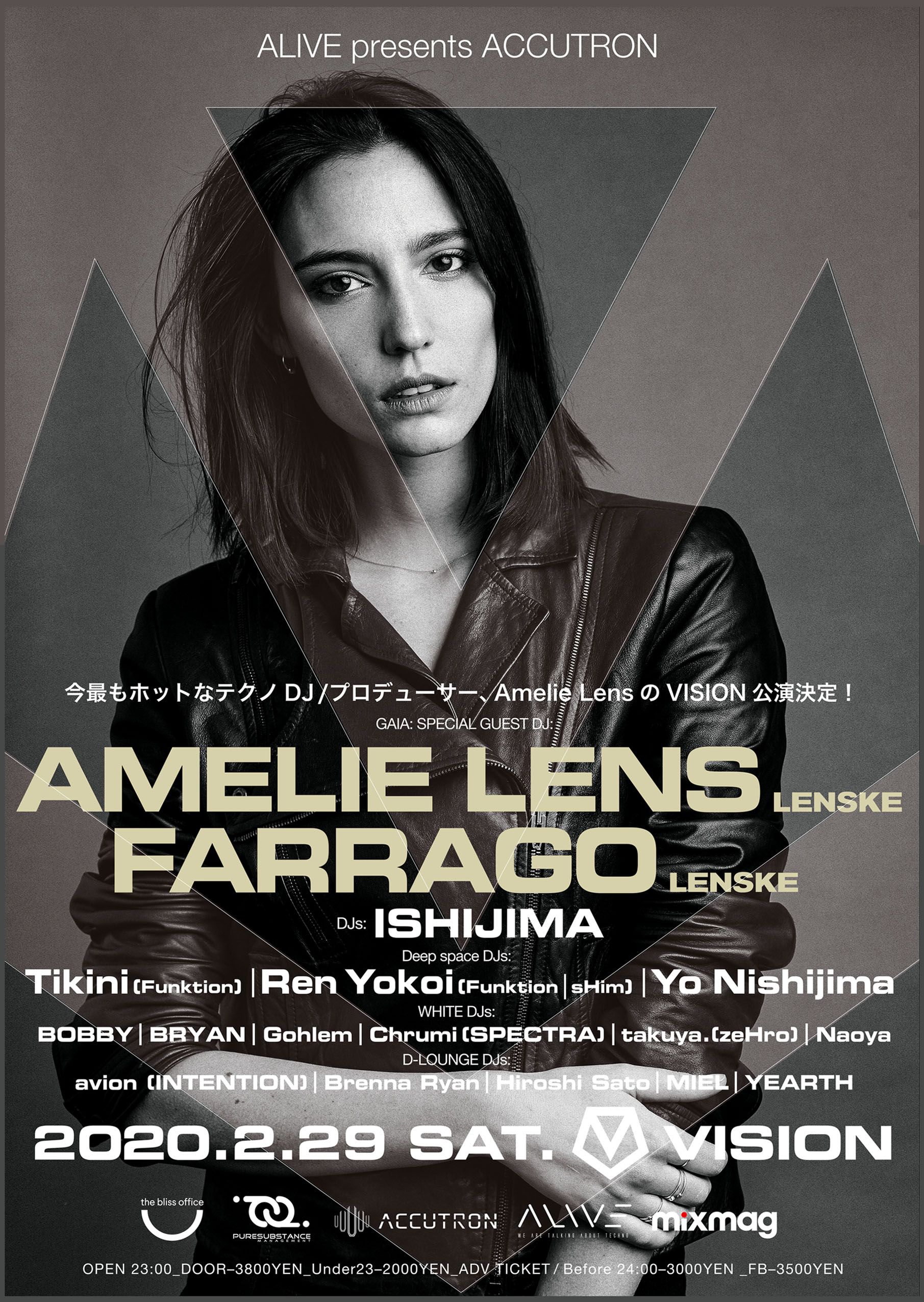 ACCUTRONは、Len Faki、Pan-Pot、Charlotte de Witteなどをゲストに招きながら、力強い直球サウンドの最新形を届けてきた。 今回のACCUTRONが迎えるのは、昨年、初来日で爆発的な集客数を叩き出した、躍進中のベルギー人アーティストAmelie Lensだ。Pan-Potのレーベル〈Second State〉から2016年に発表したEP「Let It Go」で衝撃的なデビューを果たして以降、怒涛のリリースラッシュにより、現在のテクノシーンを牽引するひとりとして地位を確固たるものにしている。 注目すべきは制作面だけではない。ベルギーのクラブLabyrinthでレジデントを務めるイベントExhaleを通じてDJとしてのアイデンティティを確立したAmelie Lensは、タフさとしなやかさを兼ね備えた独自のミックススタイルを武器に世界を駆け巡っている。オールナイト・ロングセットや人気アーティストたちとの刺激的な共演を定期的に繰り広げながら、短期間にしてDJとしての表現力を盤石なものにした。GAIAフロアでの3時間のロングセットでは、そんな彼女の魅力を余すことなく体験することができるだろう。目下大注目のDJが、忘れることのできない一夜のサウンドジャーニーへとオーディエンスを誘う!