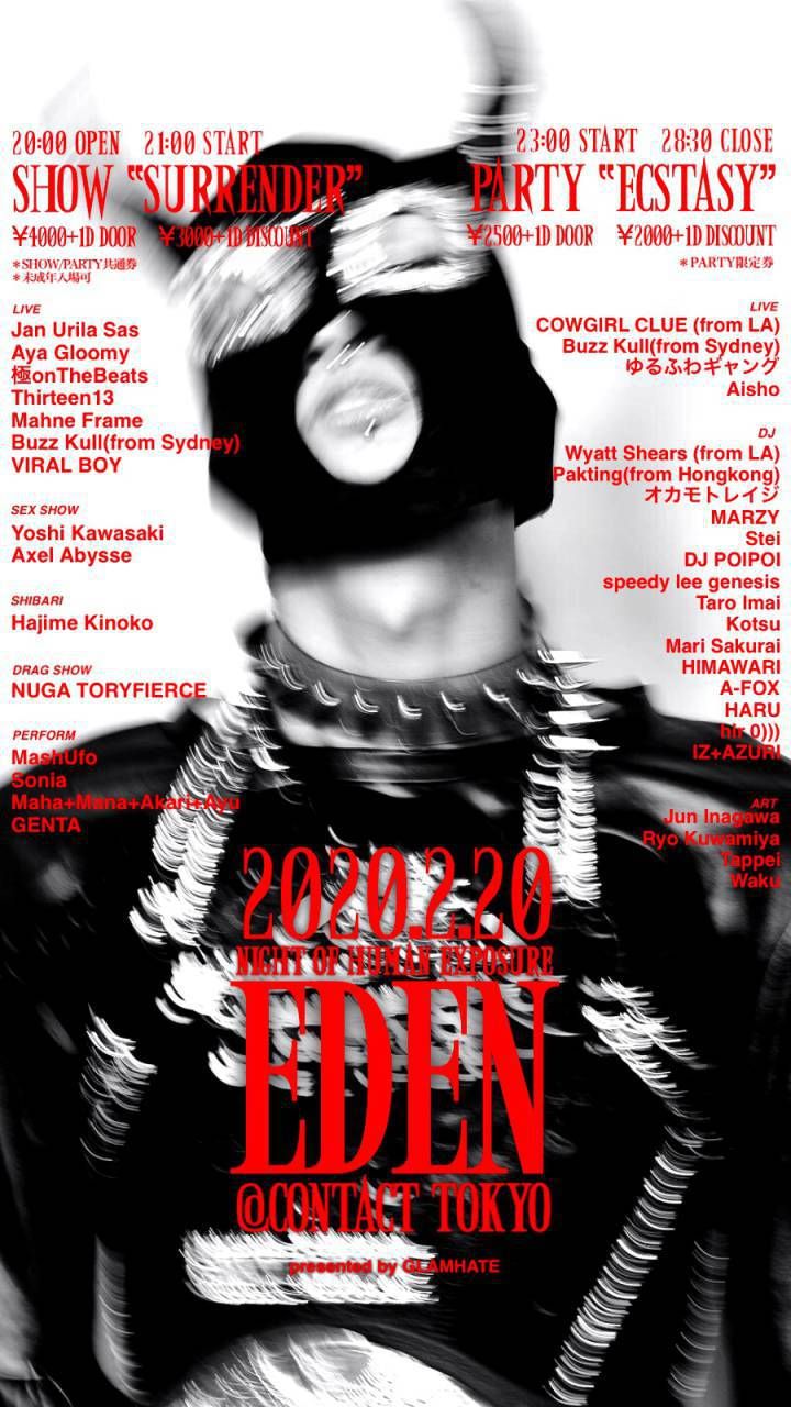 デザイナーDaisuke Fujiwaraが手がけるブランド〈GLAMHATE〉によるパーティ「EDEN」。イベントは2部構成となっており、前半部のショーとなる「SURRENDER」ではjan and naomiの片翼としても活動するJan Urila SasやAya Groomy、極onTheBeats、バンドBuzz Kull のライヴやセックスショー、シバリ、ドラァグ、パフォーマンスアートによって表現される。後半部、パーティ「ECSTASY」ではLAからCowgirl Clueやゆるふわギャングがライヴを披露。さらにこちらもLAからWyatt Shears、そして、オカモトレイジ、DJ Poipoi、Mari Sakurai、KotsuなどContactにも馴染みのあるDJが名を連ねる。