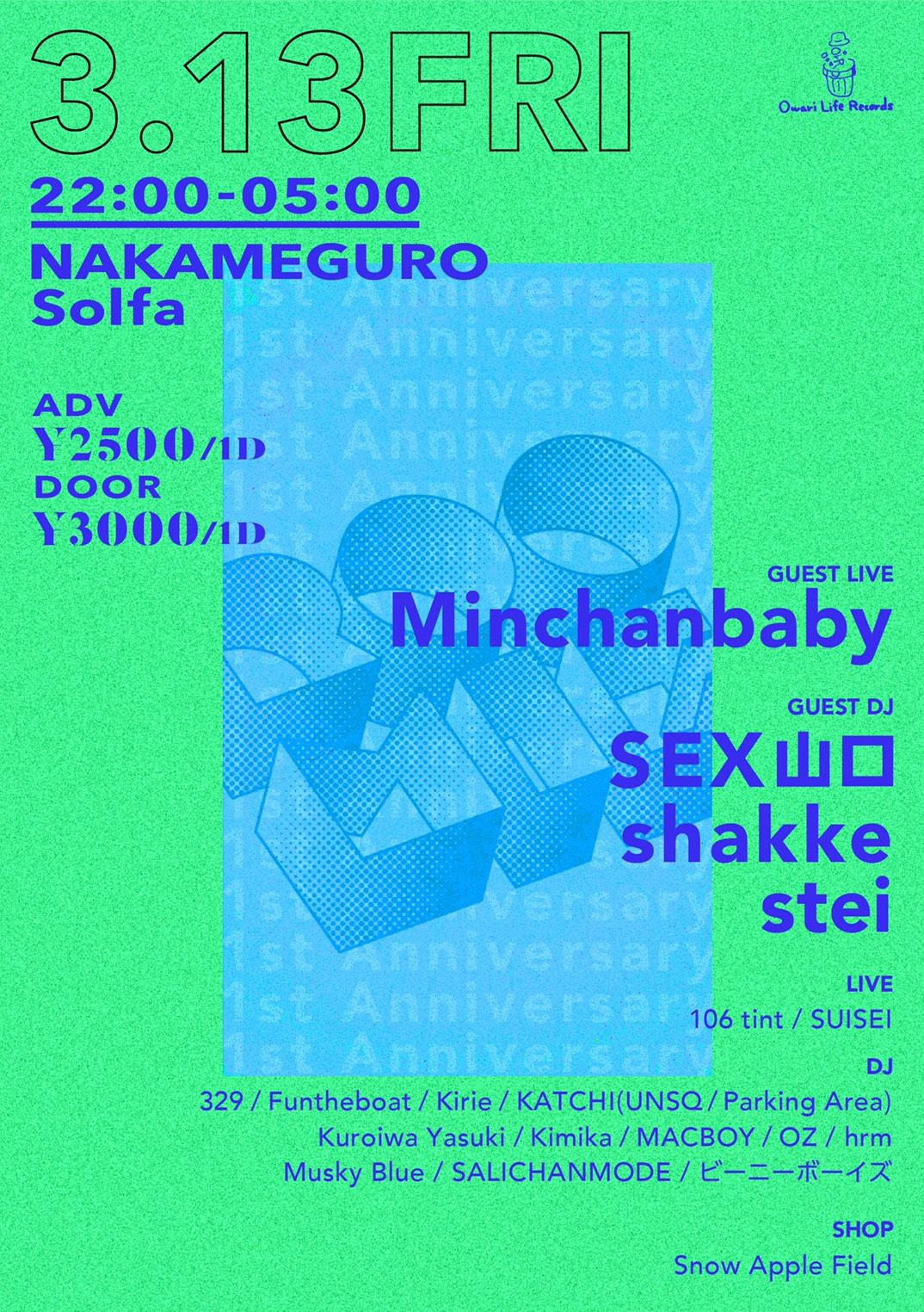今回は記念すべき1周年企画として、ゲストライブにMinchanbabyを軸にSEX山口ら実力派DJをゲストに迎える。