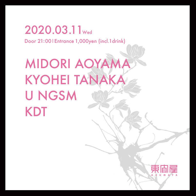 2020.03 11 MAR Azumaya -Wednesday- HOUSE 0 Shares Facebook Twitter google Line DATE: 2020-03-11 WED OPEN: 21:00 VENUE: PRICE: Entrance 1,000yen(incl. 1drink) LINE UP: MIDORI AOYAMA KYOHEI TANAKA U NGSM KDT