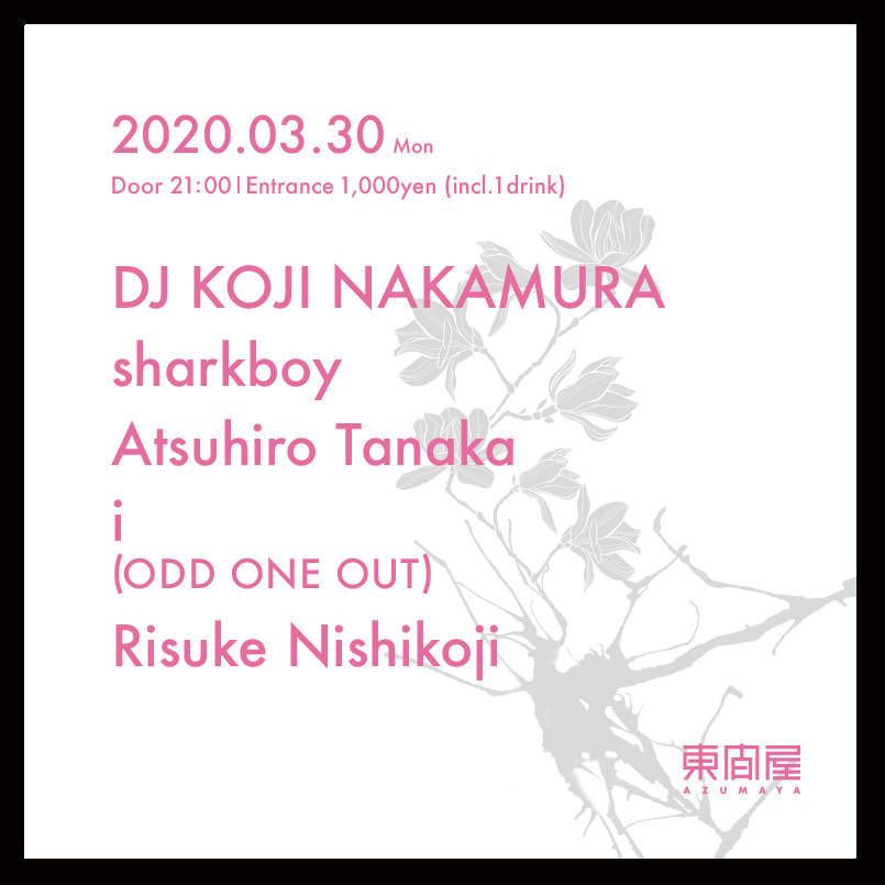 2020.03 30 MAR Azumaya -Monday- HOUSE TECHNO 0 Shares Facebook Twitter google Line DATE: 2020-03-30 MON OPEN: 21:00 VENUE: PRICE: Entrance 1,000yen(incl. 1drink) LINE UP: DJ KOJI NAKAMURA sharkboy Atsuhiro Tanaka i (ODD ONE OUT) Risuke Nishikoji
