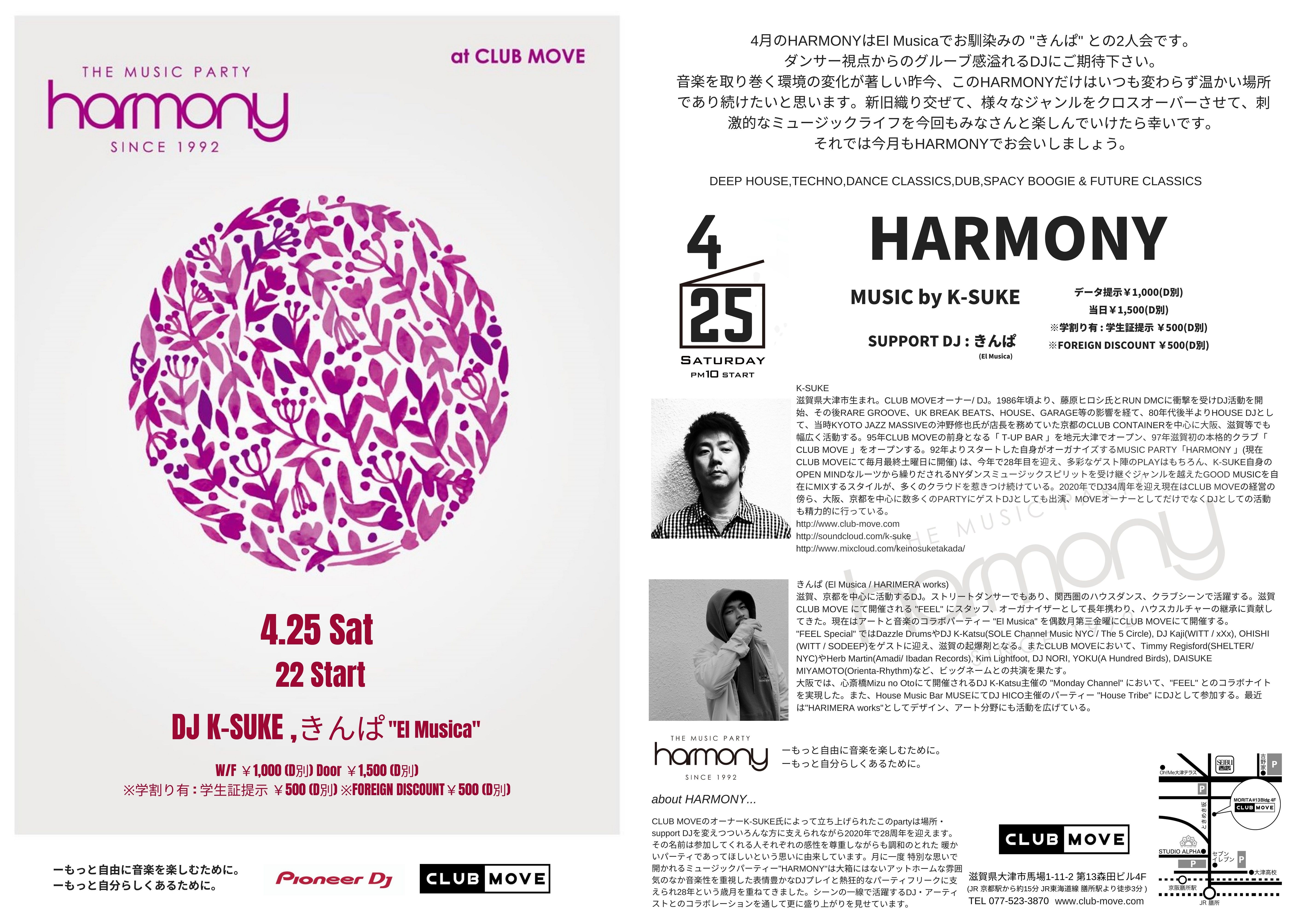 4月のHARMONYはEl Musicaでお馴染みのきんぱとの2人会です。ダンサー視点からのグルーブ感溢れるDJにご期待下さい。