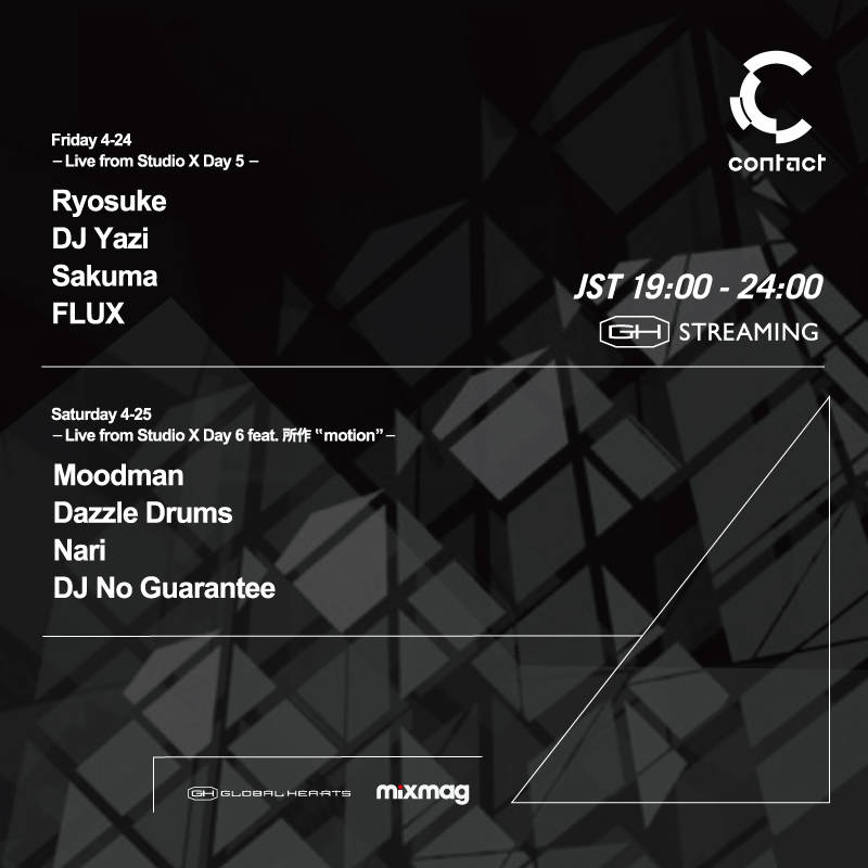 今週末のGH STREAMINGには、DJ NOBUからの信頼も厚く千葉を拠点に活躍を続けるRYOSUKE、Berlin AtonalやHerrensaunaにも出演した実力派DJ YAZI、その膨大な知識と変幻自在なスタイルで人気のMOODMAN、東京ディープハウスシーンを牽引するユニットDAZZLE DRUMSなどが登場する。