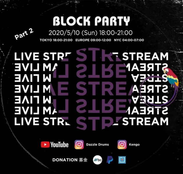 2020.05 10 MAY [Live Streaming] Block Party Live Stream 'Block Party Classics' PICK UP HOUSE DISCO 0 Shares Facebook Twitter google Line DATE: 2020-05-10 SUN OPEN: 18:00 VENUE: PRICE: ドネーション制 LINE UP: Dazzle Drums, Kengo TOKYO 18:00-21:00 13年以上毎月続くBlock Partyが、2回目のライブ配信を実施! Dazzle DrumsのYouTubeとInstagramにて19-21時に、またKengoのInstagramにて18-19時にDJ Setを配信予定。