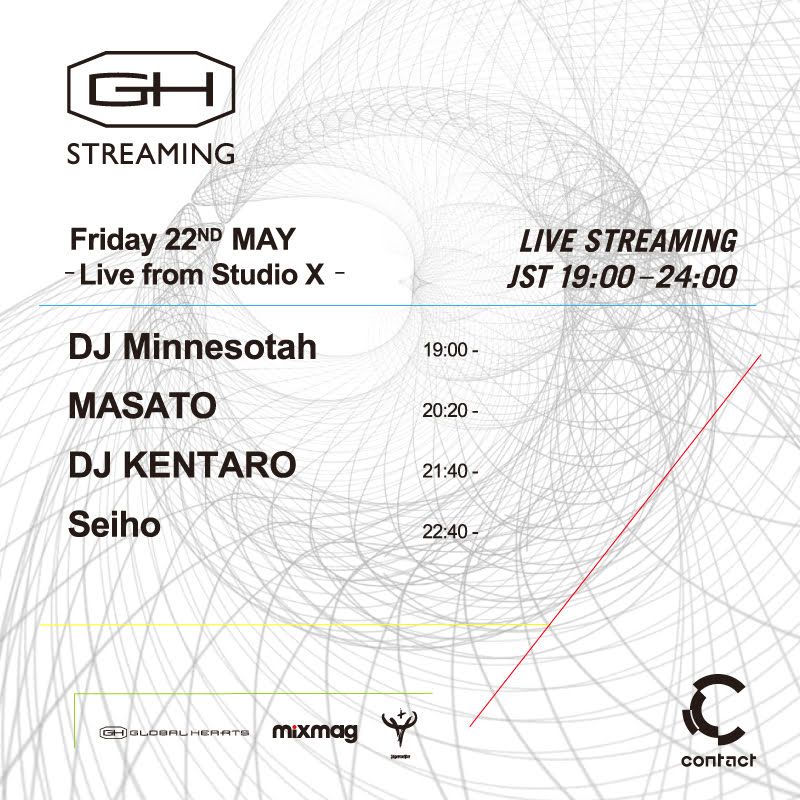 今回のGH STREAMINGには、世界最大のDJバトル「DMC World Final 2002」においていまだやぶられることのない大会史上最高得点というギネス記録に名を残す、文字通りの圧勝でアジアから初の世界チャンピオンに輝き、世界中で活躍するDJ Kentaroを迎える。そして、ビート・メイカー、プロデューサーとしても様々なアーテイストへ楽曲提供を行っている他、自身の海外ツアー、リリースも好評なSeihoに加え、contactでも毎月第2火曜日に開催されているレギュラーイベントmariより、ヒップホップクルーKANDYTOWNのDJ、MASATOとDJ Minnesotahの2人が登場。