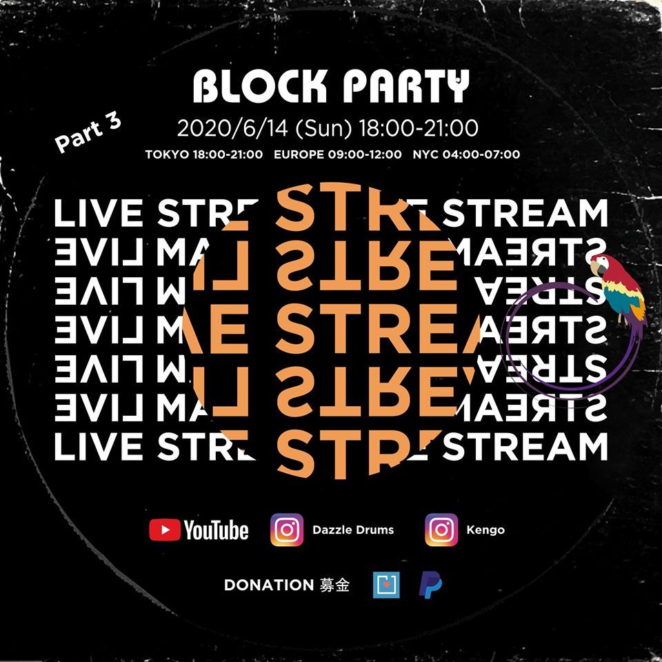 In this situation at COVID-19, this time Block Party will be broadcasting again at 18:00-21:00 JST on Sunday June 14th. The DJ Set will be live on Dazzle Drums YouTube and Instagram at 19:00-21:00 JST, and Kengo Instagram at 18:00-19:00 JST.