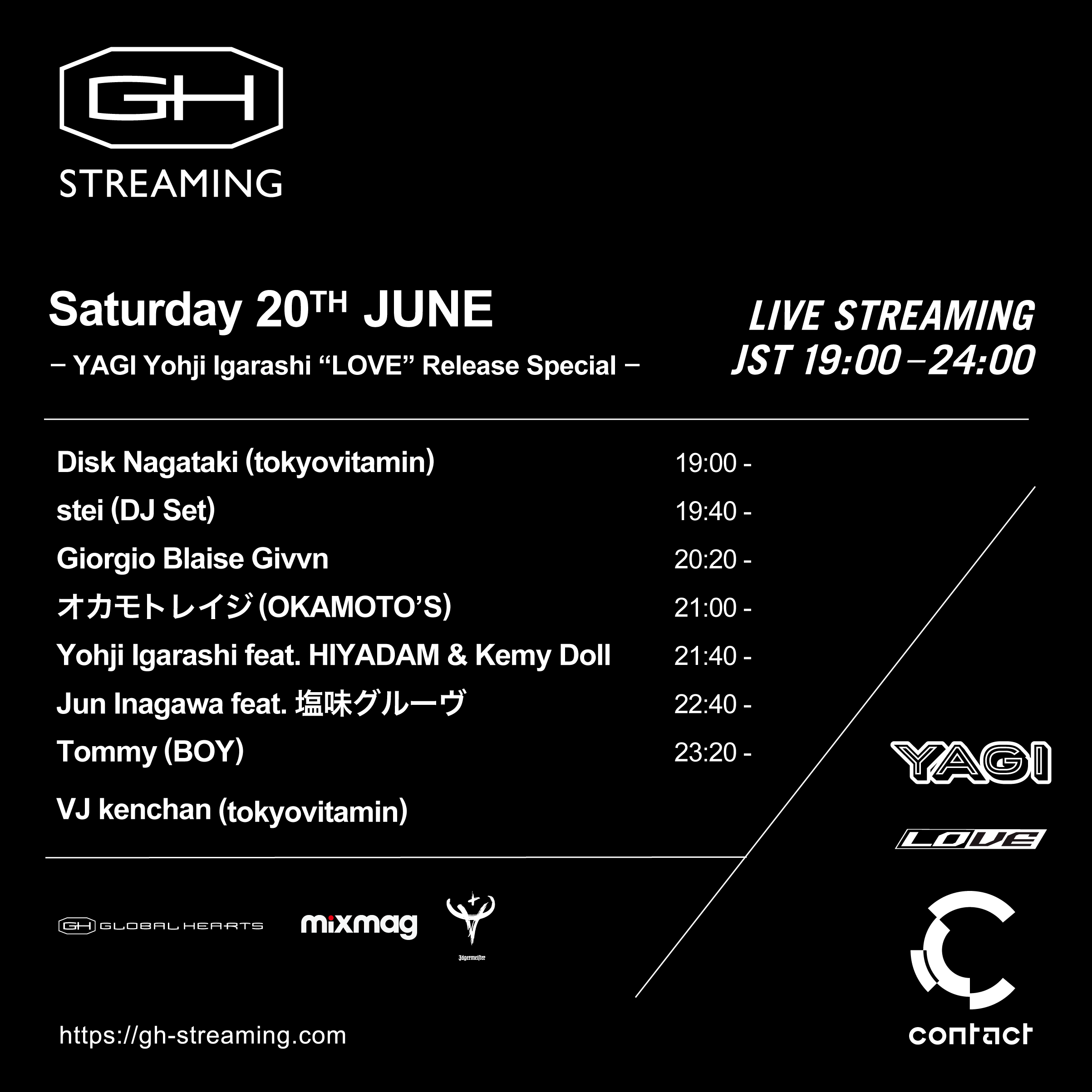 今回のGH STREAMINGは、オカモトレイジ (OKAMOTO’S)が中心となり全国各地で積極的に行なってきたYAGIが初のオンライン開催決定。今回は、YAGI 〜Yohji Igarashi “LOVE” Release Special〜と題し、5月27日にリリースされたYohji Igarashiの2nd EP「LOVE」を祝した内容となっている。出演陣には、本EP収録の「Empty Room」でも共演したHIYADAM & Kemy DollがYohji IgarashiのDJに参加する他、tokyovitaminのDISK NAGATAKIやGiorgio Blaise Givvn、stei、JUN INAGAWA feat. 塩味グルーヴ、TOMMY (BOY)等が出揃う