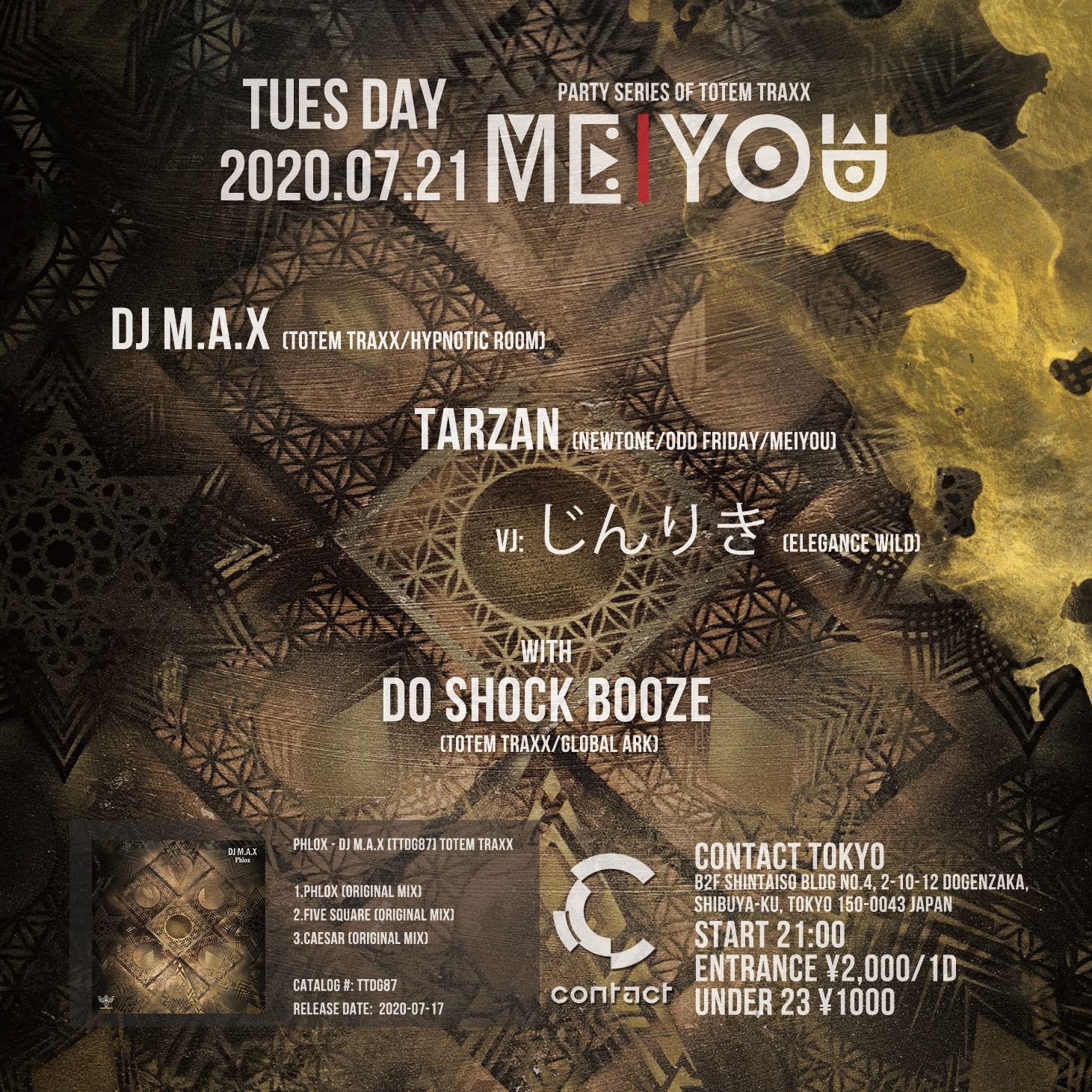 TOTEM TRAXX主宰のDO SHOCK BOOZE、音響エンジニア兼プロデューサーのDJ M.A.X、そして、1周年を迎えた人気パーティNewTone首謀、MEiYOUレギュラーのTARZANの3DJのみで構成し、それぞれの持ち味が充分に発揮されるロングセットでストーリー性の高いフロアを構築。Vj じんりき (elegance WILD)による、光るマーキングが施されたフロアとのコラボレーションがさらなる没入空間を創造する。