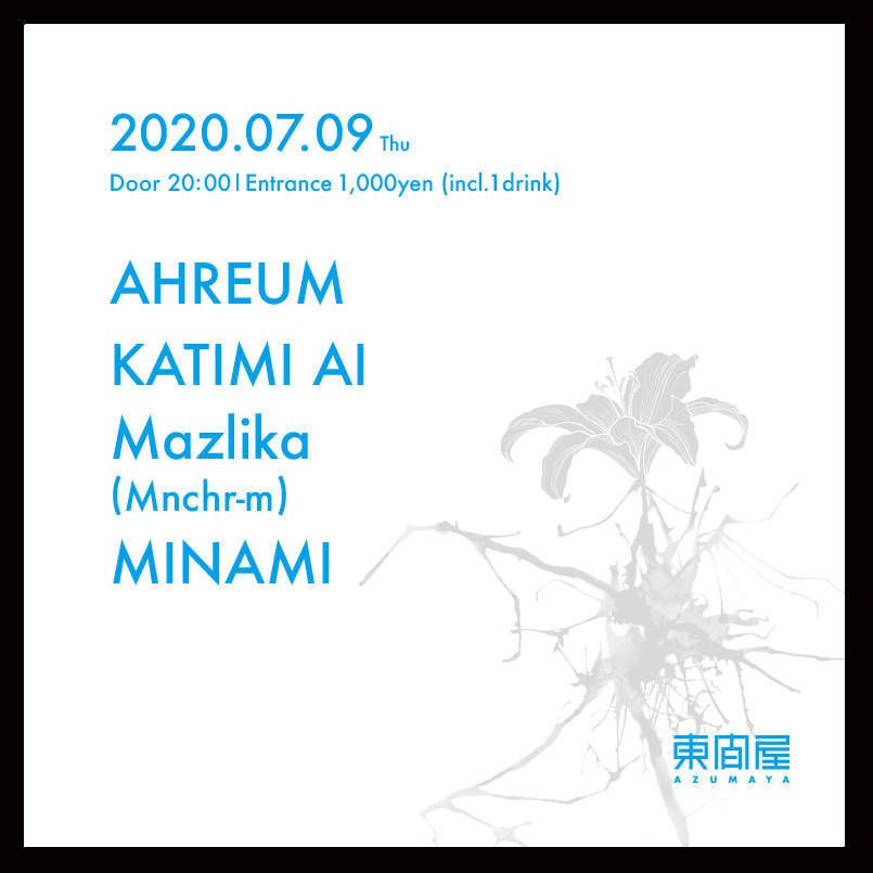 2020.07 09 JUL Azumaya -Thursday- TECHNO HOUSE 0 Shares Facebook Twitter google Line DATE: 2020-07-09 THU OPEN: 20:00 VENUE: PRICE: Entrance 1,000yen(incl. 1drink) LINE UP: AHREUM KATIMI AI Mazlika (Mnchr-m) MINAMI
