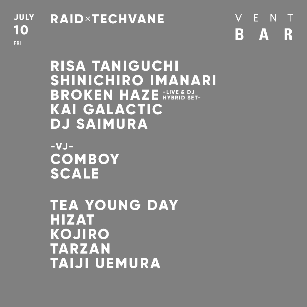 RAIDはBROKEN HAZEとDJ SAIMURAを軸に動き出すインダストリアルでエクスペリメンタルなTechnoを中心とした新しいプロジェクト/レーベルであり、今回はTECHVANEとのコラボイベントを開催する。
