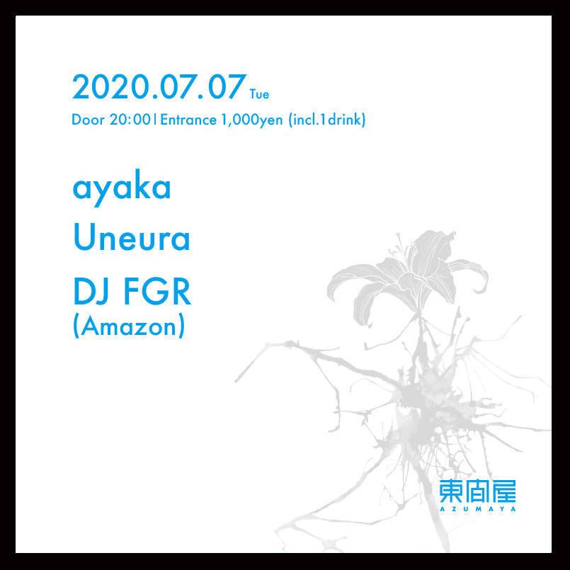 2020.07 07 JUL Azumaya -Tuesday- HOUSE TECHNO 0 Shares Facebook Twitter google Line DATE: 2020-07-07 TUE OPEN: 20:00 VENUE: PRICE: Entrance 1,000yen(incl. 1drink) LINE UP: ayaka Uneura DJ FGR (Amazon)