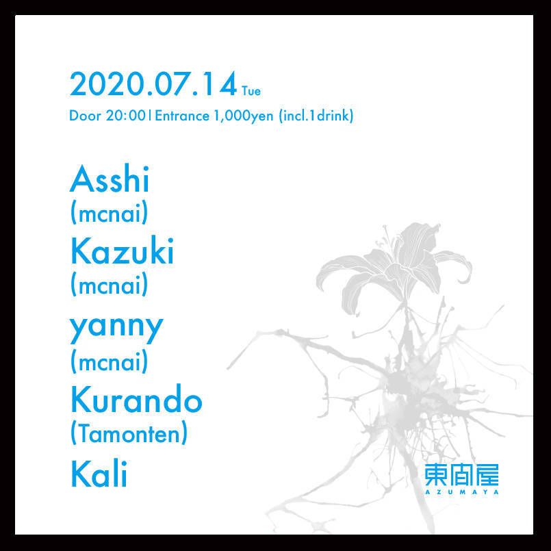 2020.07 14 JUL Azumaya -Tuesday- TECHNO HOUSE 0 Shares Facebook Twitter google Line DATE: 2020-07-14 TUE OPEN: 20:00 VENUE: PRICE: Entrance 1,000yen(incl. 1drink) LINE UP: Asshi (mcnai) Kazuki (mcnai) yanny (mcnai) Kurando (Tamonten) Kali