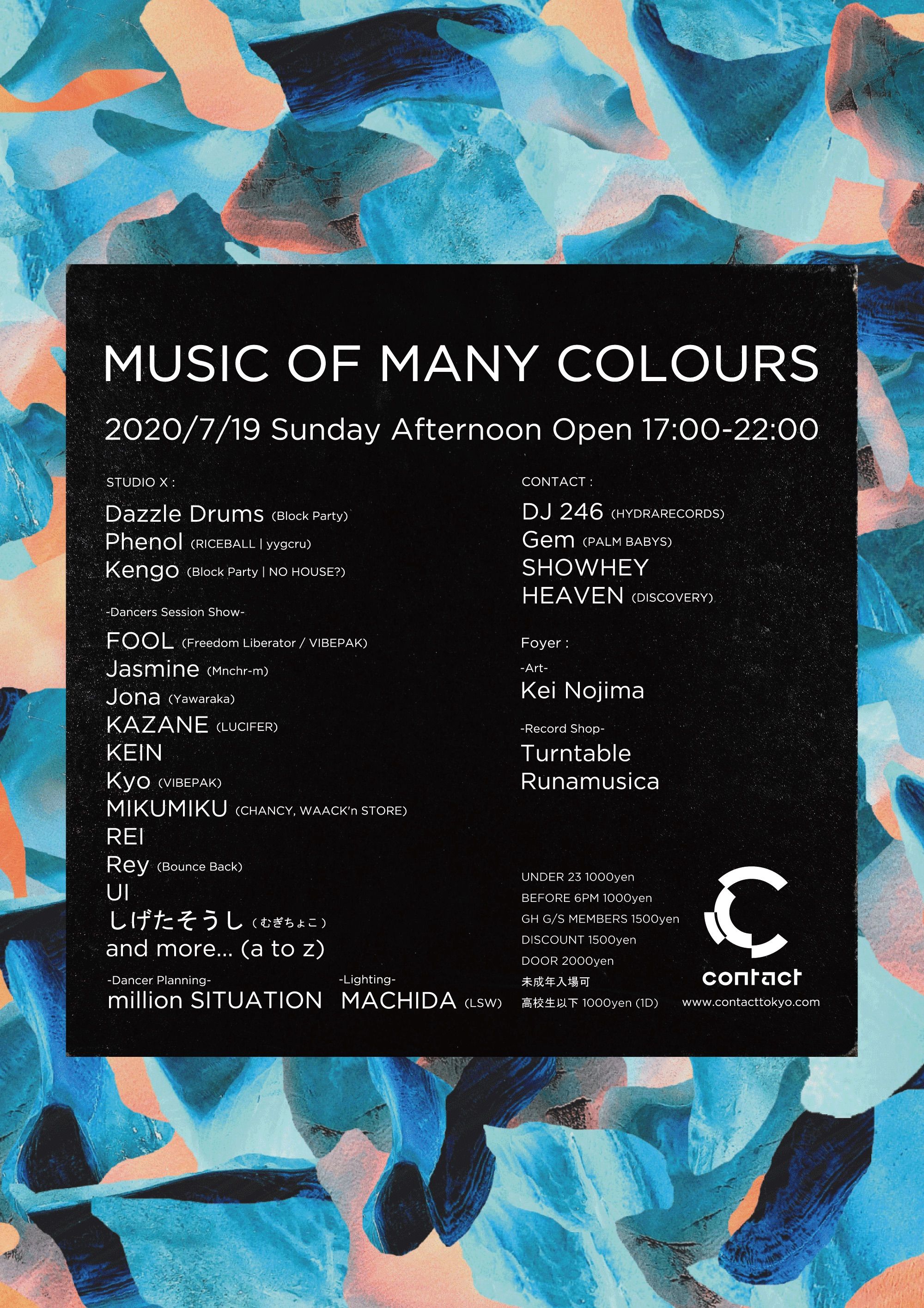 ハウスミュージック本来の多種多彩な音楽表現を詰め込んだパーティ、Music Of Many Colours。日曜夕方開催の今回は、コロナ禍だからこそダンスフロアから発する熱量と表現をストレートに伝えたい。今回のダンス・ショーケースはDazzle Drumsと即興で作り上げるセッションのみ。またゲストにはクラブジャズ/ディスコ/R&B/ハウスなど幅広い音楽性を縦横無尽にミックスし長年活動するDJ246と、ハウス/ディスコを軸にエッジを効かせながらラウンジからダンスフロアまで個性的な選曲するGemの2名。FoyerではTurntable、Runamusicaのレコードショップと、音楽のグールヴ感などをテーマにコラージュ作品を制作しているKei Nojimaの作品を展示します。