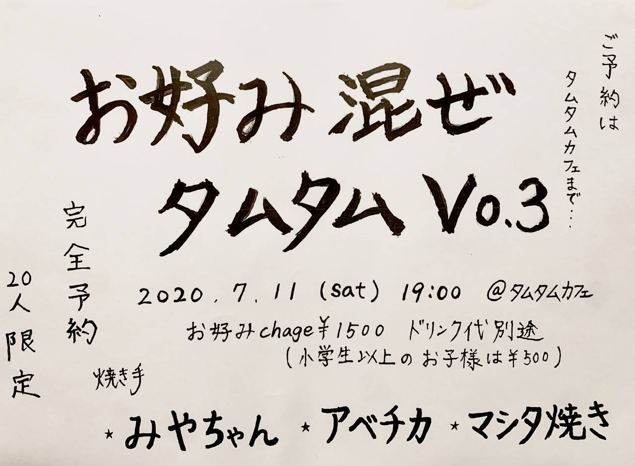 大人気の鉄板お好みパーティー『お好み混ぜタムタム』が完全予約制で帰ってくる!!それぞれが、それぞれの焼き方・こだわりの具材で…。今回は人数限定で、予約必須◎ご予約はタムタムカフェまで連絡してくださーい☆地ソース多数取り揃えており〼匂いで飲めるー!
