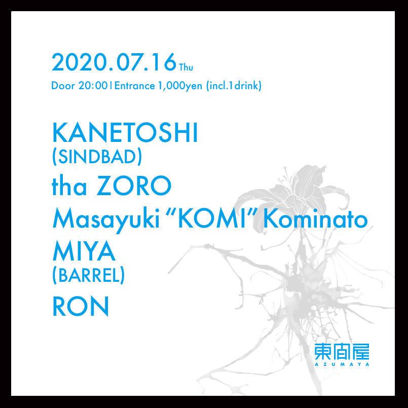 2020.07 16 JUL Azumaya -Thursday- HOUSE TECHNO 0 Shares Facebook Twitter google Line DATE: 2020-07-16 THU OPEN: 20:00 VENUE: PRICE: Entrance 1,000yen(incl. 1drink) LINE UP: KANETOSHI (SINDBAD) tha ZORO Masayuki “KOMI” Kominato MIYA (BARREL) RON