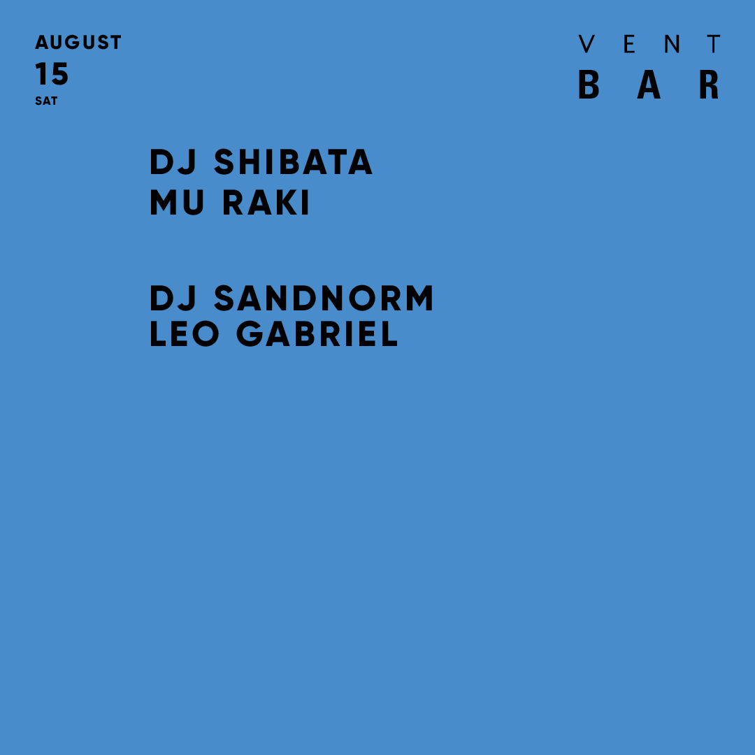 8月15日のVENT BARにはDJ Shibata、Mu Raki、DJ Sandnorm、Leo Gabrielが登場!