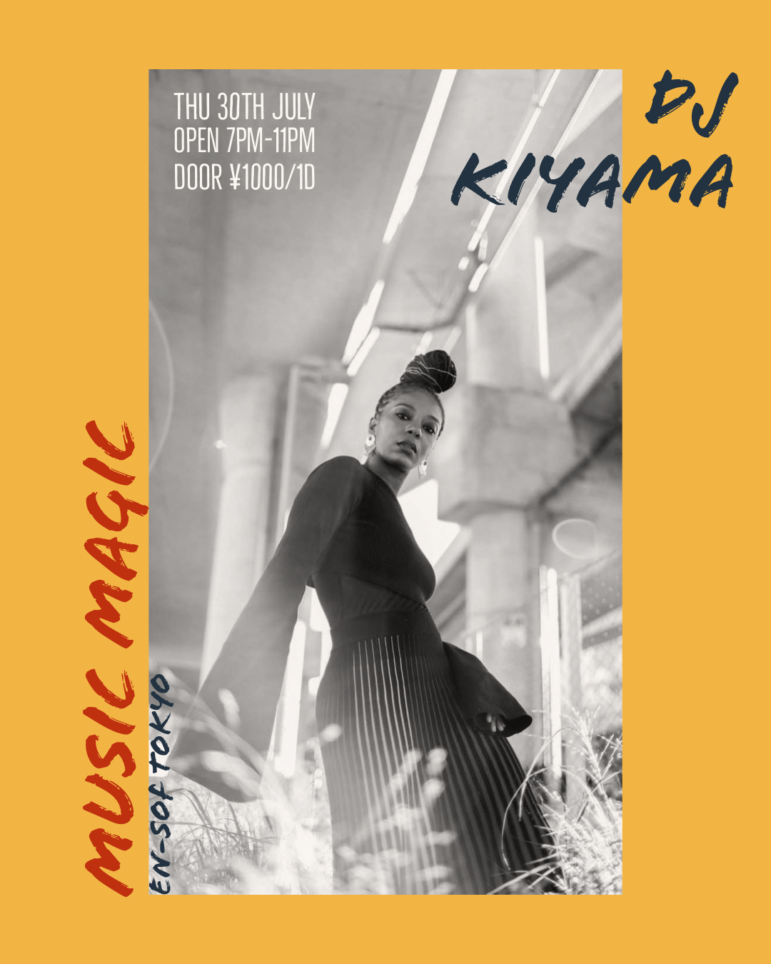 渋谷EN-SOF TOKYOにて毎週木曜日開催されている『MUSIC MAGIC』。ハウスを軸にダブ、ルーツ、ラバーズ、アフロ、ファンク、ソウル、ラテン、ブラジル、ジャズファンク、ロック、ニューウェーブ、80's等の新譜を中心に珠玉のレコードを厳選しプレイしている。ResidentのDJ KIYAMAは78年よりDJを開始し現在も都内のクラブ/バーを中心に精力的な活動を行なっている。これまでにJ WAVEやFM TOKYOのラジオ番組制作をはじめ、伝説のAIR FM、渋谷FMの開局に携わり、宇多田ヒカルのリミックスや楽曲のリリース等ダンスミュージックの発展に大きく貢献してきた。DJの中でも楽曲の知識は群を抜きハードディガーとしても知られるがショッピングモール等の商業施設、企業のレセプションパーティー、有線のアダルトコンテンポラリーまでコンセプトに合わせた選曲をこなす。レコードの扱いは非常に繊細でアーティストや楽曲に対する深い愛情とリスペクトを感じずにはいられない。