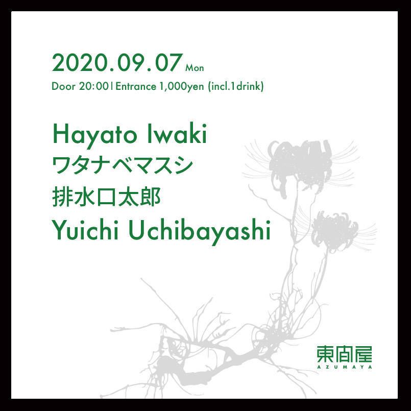 2020.09 07 SEP Azumaya -Monday- HOUSE TECHNO 0 Shares Facebook Twitter google Line DATE: 2020-09-07 MON OPEN: 20:00 VENUE: PRICE: Entrance 1,000yen(incl. 1drink) LINE UP: Hayato Iwaki ワタナベマスシ 排水口太郎 Yuichi Uchibayashi