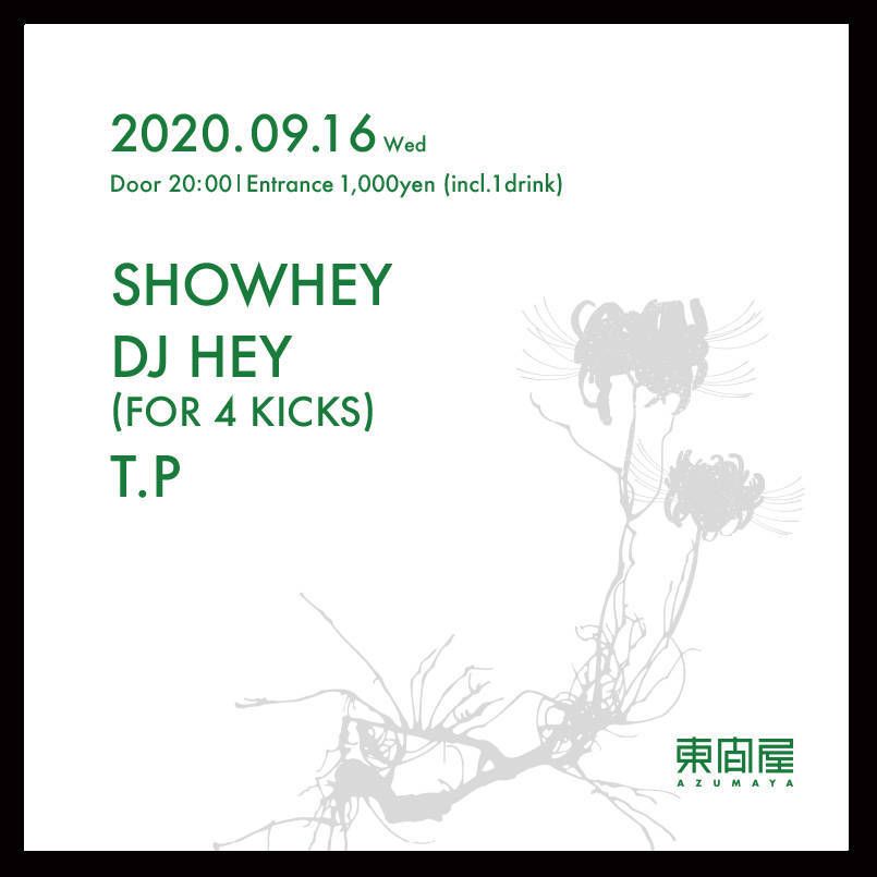 2020.09 16 SEP Azumaya -Wednesday- HOUSE TECHNO 0 Shares Facebook Twitter google Line DATE: 2020-09-16 WED OPEN: 20:00 VENUE: PRICE: Entrance 1,000yen(incl. 1drink) LINE UP: SHOWHEY DJ HEY (FOR 4 KICKS) T.P