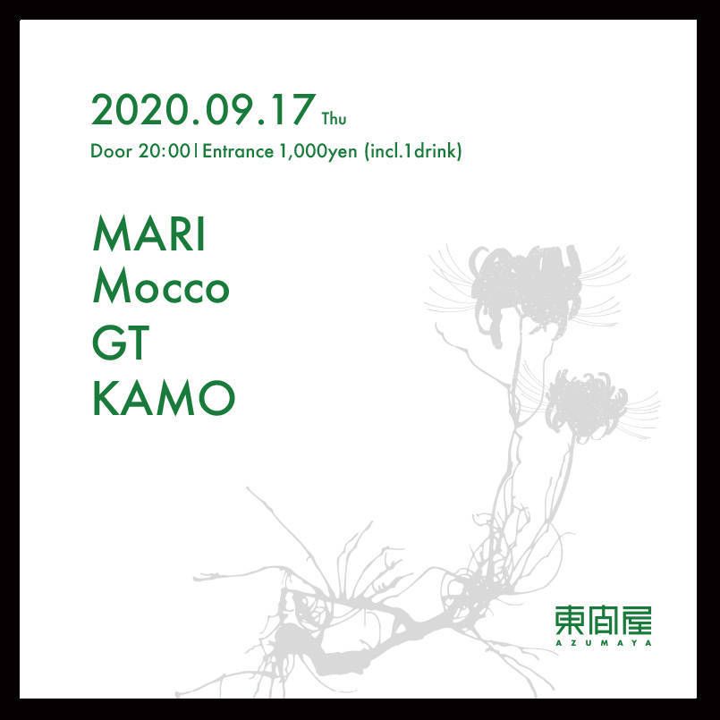 2020.09 17 SEP Azumaya -Thursday- HOUSE TECHNO 0 Shares Facebook Twitter google Line DATE: 2020-09-17 THU OPEN: 20:00 VENUE: PRICE: Entrance 1,000yen(incl. 1drink) LINE UP: MARI Mocco GT KAMO