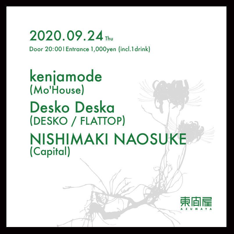 2020.09 24 SEP Azumaya -Thursday- HOUSE 0 Shares Facebook Twitter google Line DATE: 2020-09-24 THU OPEN: 20:00 VENUE: PRICE: Entrance 1,000yen(incl. 1drink) LINE UP: kenjamode (Mo'House) Desko Deska (DESKO / FLATTOP) NISHIMAKI NAOSUKE (Capital)