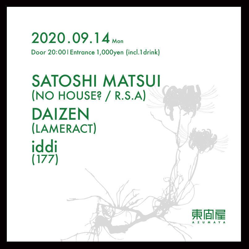2020.09 14 SEP Azumaya -Monday- HOUSE 0 Shares Facebook Twitter google Line DATE: 2020-09-14 MON OPEN: 20:00 VENUE: PRICE: Entrance 1,000yen(incl. 1drink) LINE UP: SATOSHI MATSUI (NO HOUSE? / R.S.A) DAIZEN (LAMERACT) iddi (177)