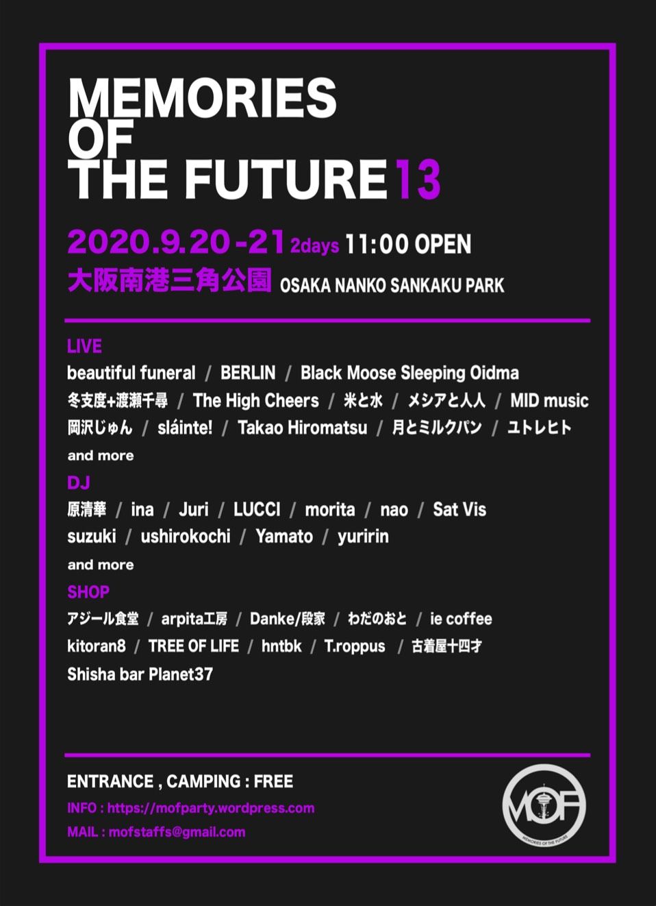 MEMORIES OF THE FUTUREはBERLIN・Black Moose Sleeping Oidmaが主催する野外フリーパーティーです。2013年9月からスタートしました。身近な自由な感じで。フリーキーにパーティーを。主催バンド含め、ジャム、アンビエント、ロック等のバンド、ちんどん楽団、そしてテクノ・ハウスDJが出演します。大阪ベイエリアが一望できる南港三角公園の芝生の上でピクニックを、お酒を、踊りを、チルアウトをお楽しみください。
