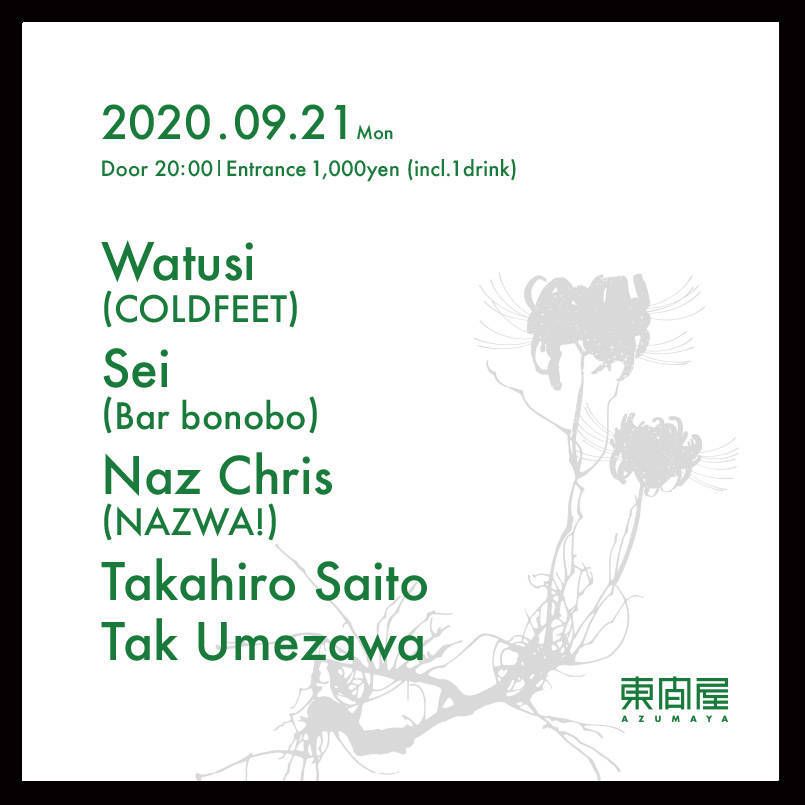 2020.09 21 SEP Azumaya -Monday- TECHNO HOUSE 0 Shares Facebook Twitter google Line DATE: 2020-09-21 MON OPEN: 20:00 VENUE: PRICE: Entrance 1,000yen(incl. 1drink) LINE UP: Watusi (COLDFEET) Sei (Bar bonobo) Naz Chris (NAZWA!) Takahiro Saito Tak Umezawa