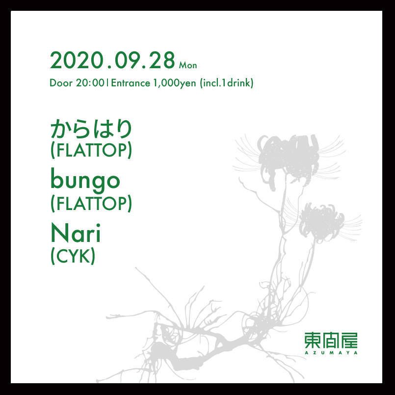 2020.09 28 SEP Azumaya -Monday- HOUSE 0 Shares Facebook Twitter google Line DATE: 2020-09-28 MON OPEN: 20:00 VENUE: PRICE: Entrance 1,000yen(incl. 1drink) LINE UP: からはり (FLATTOP) bungo (FLATTOP) Nari (CYK)