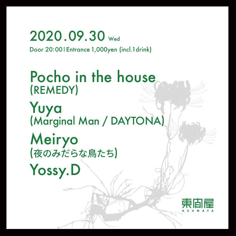 2020.09 30 SEP Azumaya -Wednesday- HOUSE 0 Shares Facebook Twitter google Line DATE: 2020-09-30 WED OPEN: 20:00 VENUE: PRICE: Entrance 1,000yen(incl. 1drink) LINE UP: Pocho in the house (REMEDY) Yuya (Marginal Man / DAYTONA) Meiryo (夜のみだらな鳥たち) Yossy.D