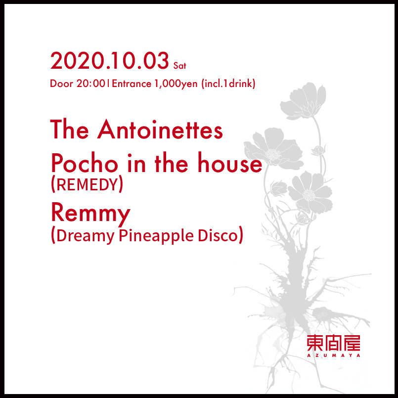 2020.10 03 OCT Azumaya -Saturday HOUSE 0 Shares Facebook Twitter google Line DATE: 2020-10-03 SAT OPEN: 20:00 VENUE: PRICE: Entrance 1,000yen(incl. 1drink) LINE UP: The Antoinettes Pocho in the house (REMEDY) Remmy (Dreamy Pineapple Disco)