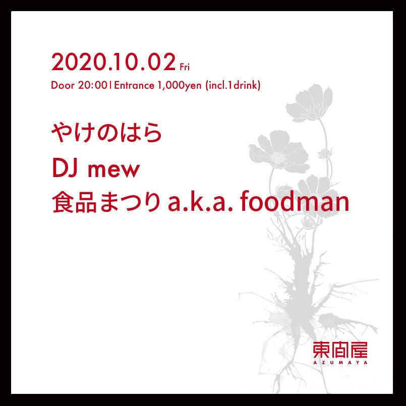 2020.10 02 OCT Azumaya -Friday- TECHNO HOUSE 0 Shares Facebook Twitter google Line DATE: 2020-10-02 FRI OPEN: 20:00 VENUE: PRICE: Entrance 1,000yen(incl. 1drink) LINE UP: やけのはら DJ mew 食品まつり a.k.a. foodman