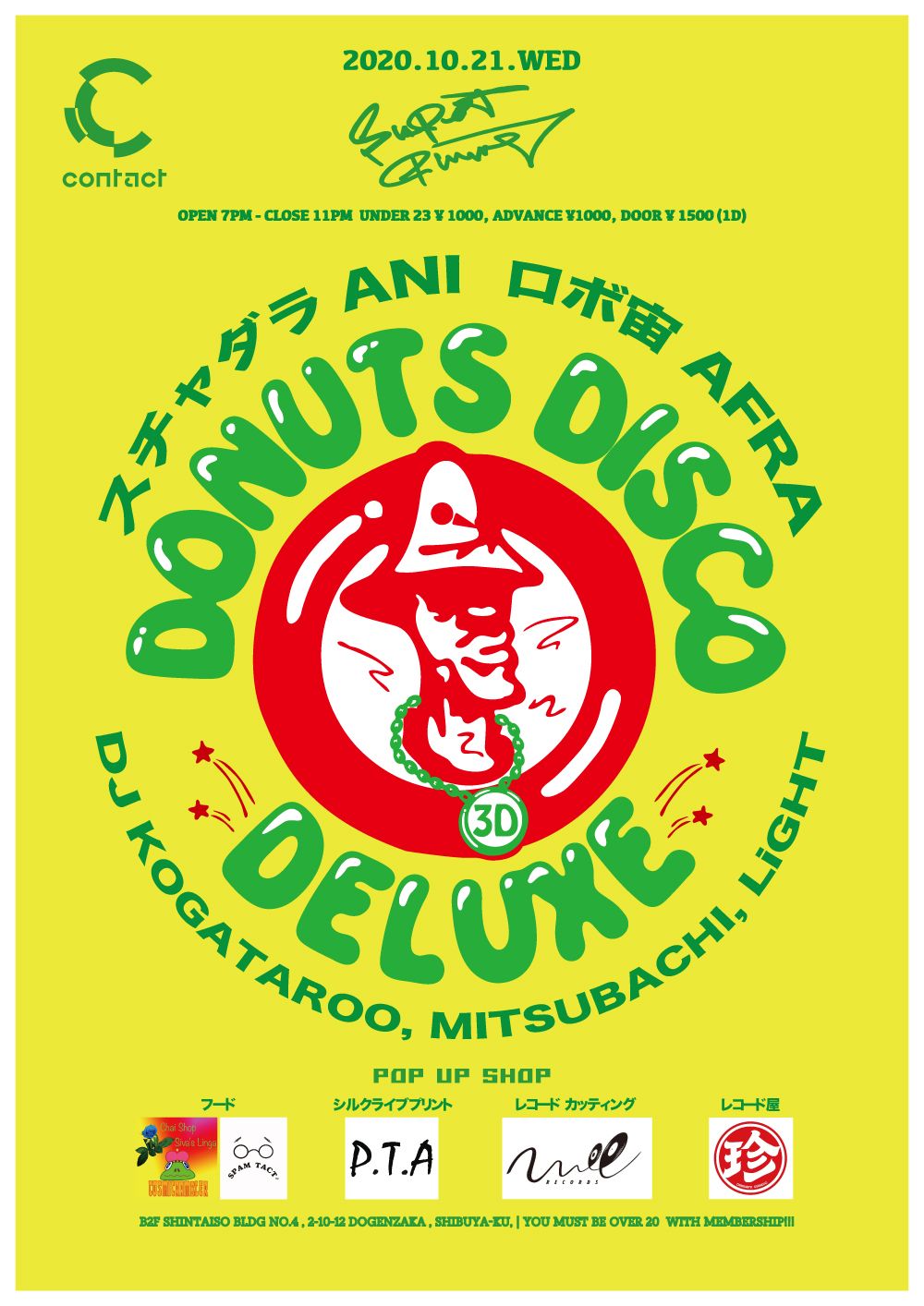 スチャダラパーANI、ロボ宙、ヒューマンビートボクサーのAFRAからなるユニットDONUTS DISCO DELUXE。70年代当時ブロンクスで行われていた野外パーティ“ブロックパーティ”のライヴ感や熱量を現代にアップデートしてきた。フジロックなどの野外フェスから日本独自のブロックパーティである盆踊り迄、音が鳴らせる場所なら何処へでもヒップホップ、ソウル、ファンク、ディスコを軸に、DJ/MC/ヒューマンビートボクサーと3人3様の芸当を畳みかけるように繰り出すそのスタイルは、音楽やパーティ本来の楽しさを教えてくれると共に、他にはない独自のパーティ感を作り出している。毎回のスペシャルゲストもさることながら、レギュラーで出店するフード/レコード店/オリジナルドーナツ盤のダイレクトカッティング/シルクライブプリント/アーティストによるレアなグッズ販売店などなど、充実したポップアップもゆっくりと楽しめる。平日の終電までの面白空間で遊び尽くそう!