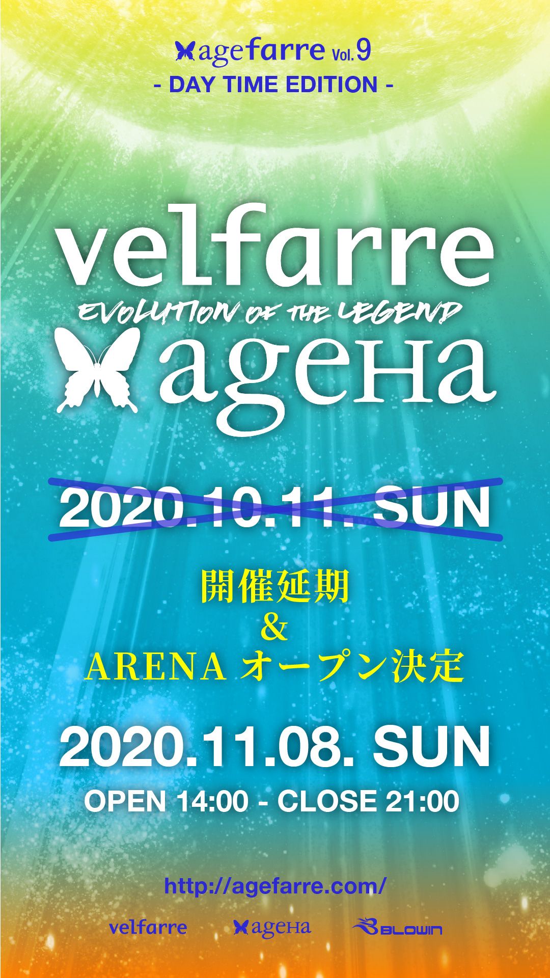2020年10月11日(日) に開催を予定しておりました"agefarre 2020" OPEN AIR EDITIONですが、台風14号の影響により悪天候が予想されております。屋外をメインにしているイベントでもありますので、お客様・スタッフ・アーティストの安全を第一に考え、11月8日(日)にARENAをオープンして、14:00スタートのデイイベントとして開催延期とさせていただきます。