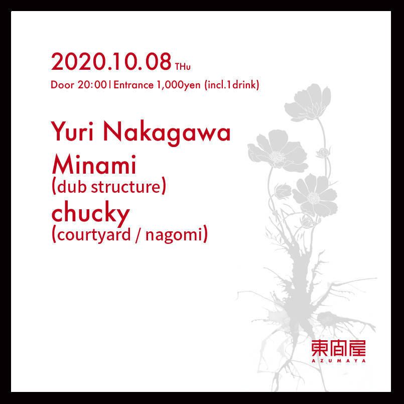 2020.10 08 OCT Azumaya -Thursday- HOUSE 0 Shares Facebook Twitter google Line DATE: 2020-10-08 THU OPEN: 20:00 VENUE: PRICE: Entrance 1,000yen(incl. 1drink) LINE UP: Yuri Nakagawa Minami (dub structure) chucky (courtyard / nagomi)