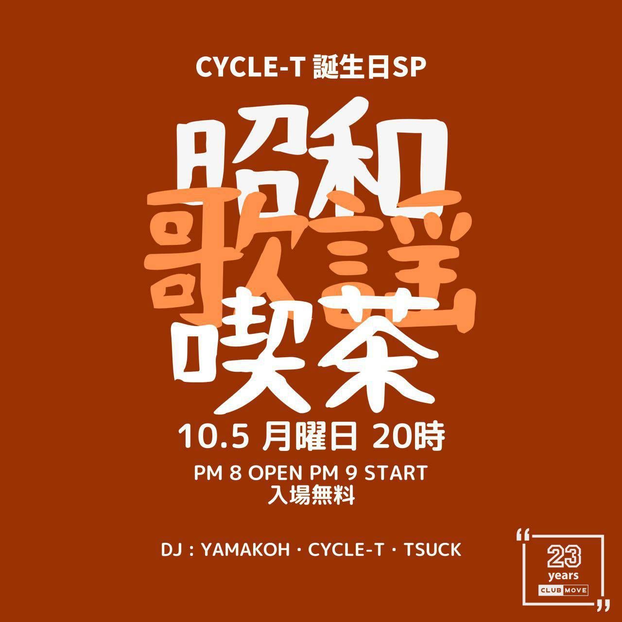 近江のJBこと "CYCLE-T" の誕生日スペシャル。1987年当時,滋賀で初めてのラッパーとしてフロアーをスクリームし続け今なお現役で伝説を創り続けている滋賀クラブシーン伝説のキーマン、CYCLE-Tの昭和歌謡SETのDJを見逃すな!