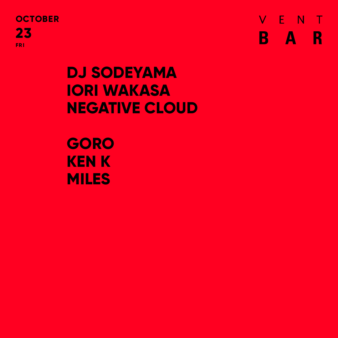 10月23日のVENT BARには、DJ SODEYAMA、Iori Wakasa、Negative Cloud、GORO、KEN K、MILESが登場!
