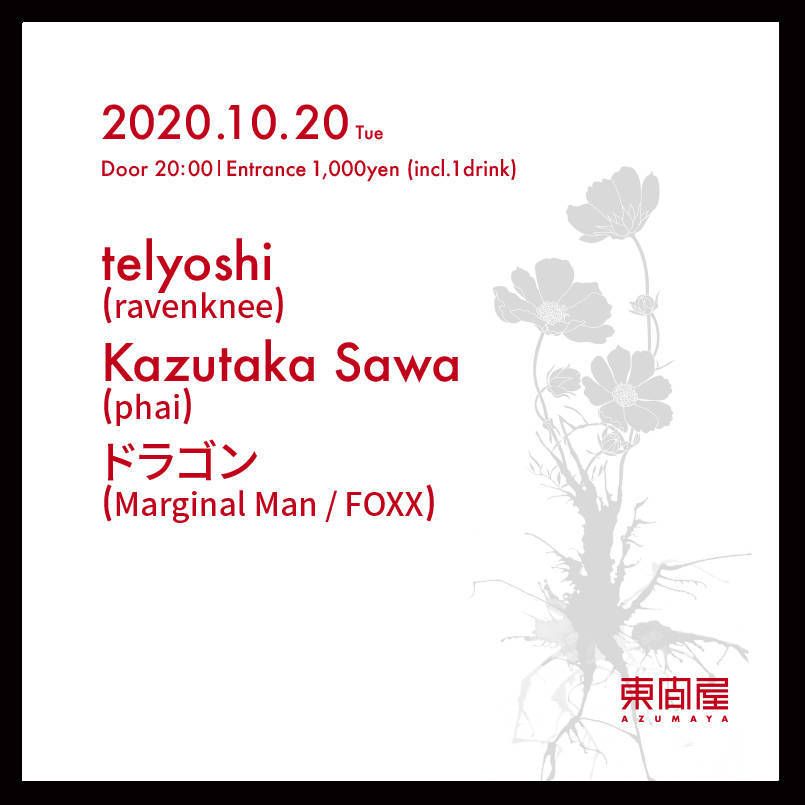 2020.10 20 OCT Azumaya -Tuesday- HOUSE TECHNO 0 Shares Facebook Twitter google Line DATE: 2020-10-20 TUE OPEN: 20:00 VENUE: PRICE: Entrance 1,000yen(incl. 1drink) LINE UP: telyoshi (ravenknee) Kazutaka Sawa (phai) ドラゴン (Marginal Man / FOXX)