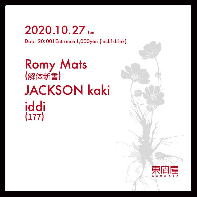 2020.10 27 OCT Azumaya -Tuesday- HOUSE TECHNO 0 Shares Facebook Twitter google Line DATE: 2020-10-27 TUE OPEN: 20:00 VENUE: PRICE: Entrance 1,000yen(incl. 1drink) LINE UP: Romy Mats (解体新書) JACKSON kaki iddi (177)