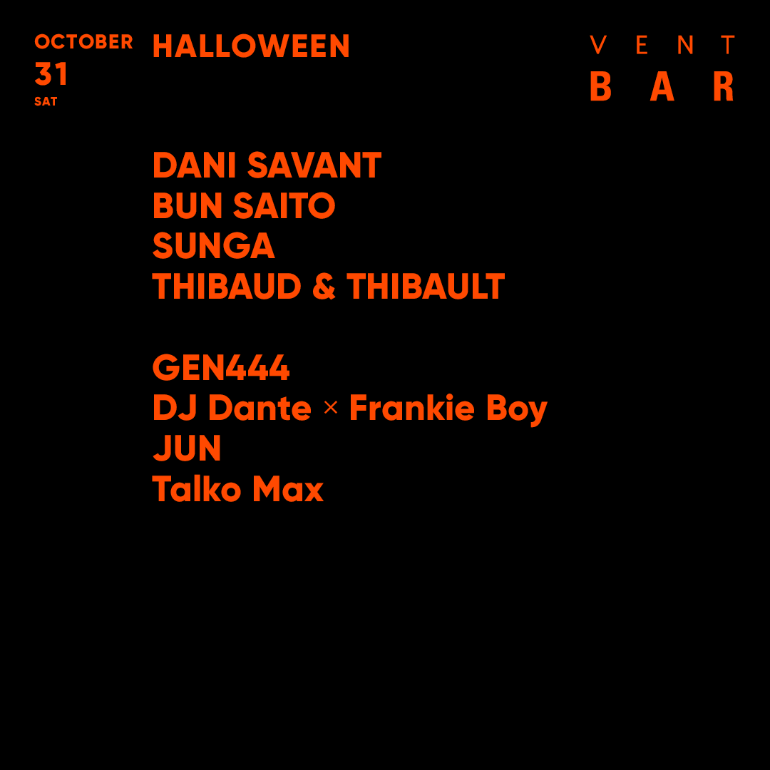 【 10月31日のHALLOWEEN / VENT BARにDani Savant、Bun Saito、SUNGAが登場! 】