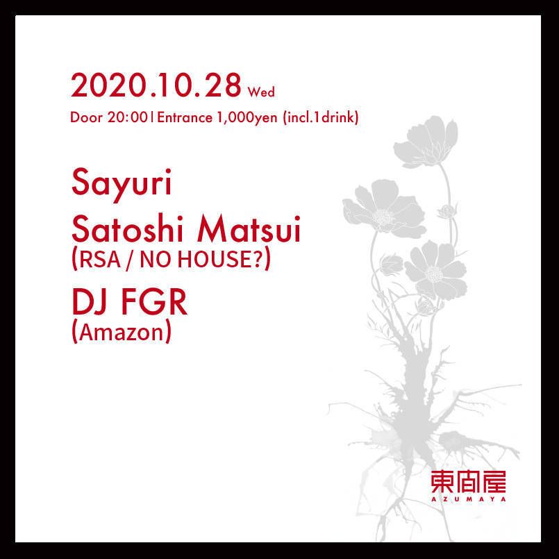 2020.10 28 OCT Azumaya -Wednesday- HOUSE 0 Shares Facebook Twitter google Line DATE: 2020-10-28 WED OPEN: 20:00 VENUE: PRICE: Entrance 1,000yen(incl. 1drink) LINE UP: Sayuri, Satoshi Matsui, DJ FGRSayuri Satoshi Matsui (RSA / NO HOUSE?) DJ FGR (Amazon)