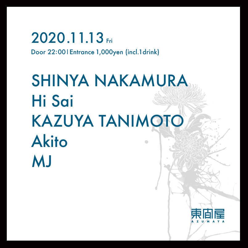 2020.11 13 NOV Azumaya -Friday- HOUSE TECHNO 0 Shares Facebook Twitter google Line DATE: 2020-11-13 FRI OPEN: 22:00 VENUE: PRICE: Entrance 1,000yen(incl. 1drink) LINE UP: SHINYA NAKAMURA Hi Sai KAZUYA TANIMOTO Akito MJ