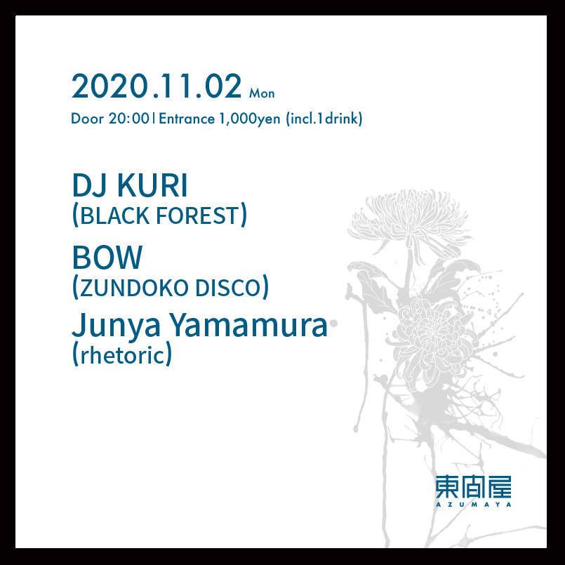 2020.11 02 NOV Azumaya -Monday- TECHNO 0 Shares Facebook Twitter google Line DATE: 2020-11-02 MON OPEN: 20:00 VENUE: PRICE: Entrance 1,000yen(incl. 1drink) LINE UP: DJ KURI (BLACK FOREST) BOW (ZUNDOKO DISCO) Junya Yamamura ((rhetoric)