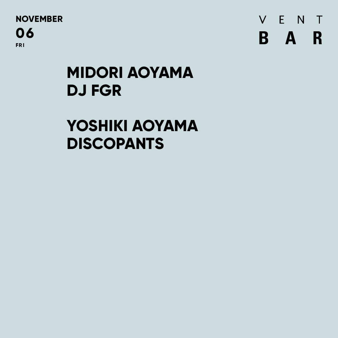 【 11月6日のVENT BARに、Midori Aoyama、DJ FGR、Yoshiki Aoyama、discopantsが登場 】