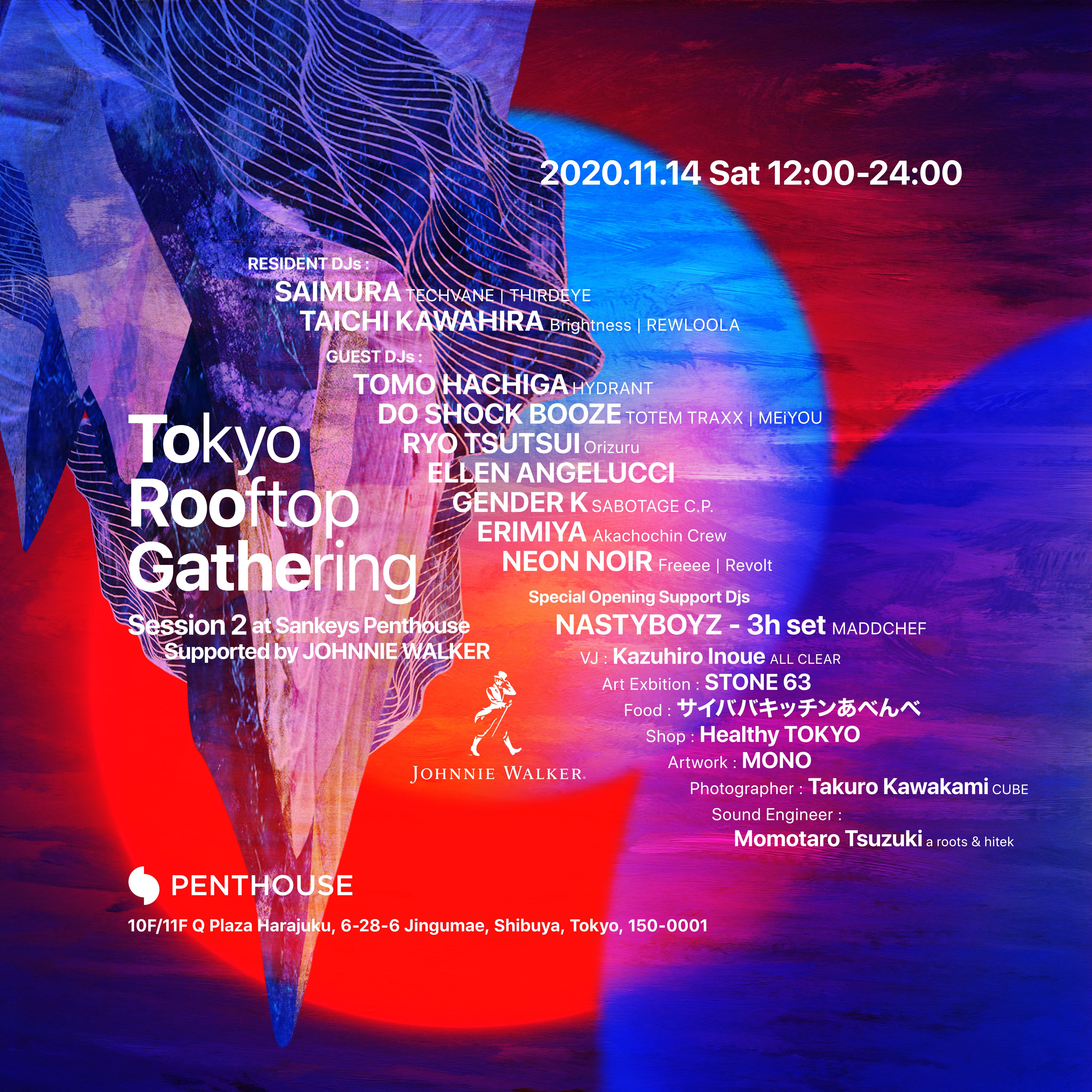 東京-原宿の真ん中キュープラザ最上階、東京の街並みを一望するロケーションを誇るSankeys Penthouseにて、前回夏の開催も大盛況のうちに幕を閉じた〝Tokyo Rooftop Gathering〟が再び開催。今回も日本を代表する実力派の手練れが集結し、よりパワーアップしての12時間ルーフトップレイヴを敢行。サウンドエンジニアには〝Momotaro Tsuzuki〟を迎え会場の音響ポテンシャルを最大限に引き出す。気鋭の映像家〝Kazuhiro Inoue〟による演出、鬼才〝STONE 63〟によるアートショーケースも必見。