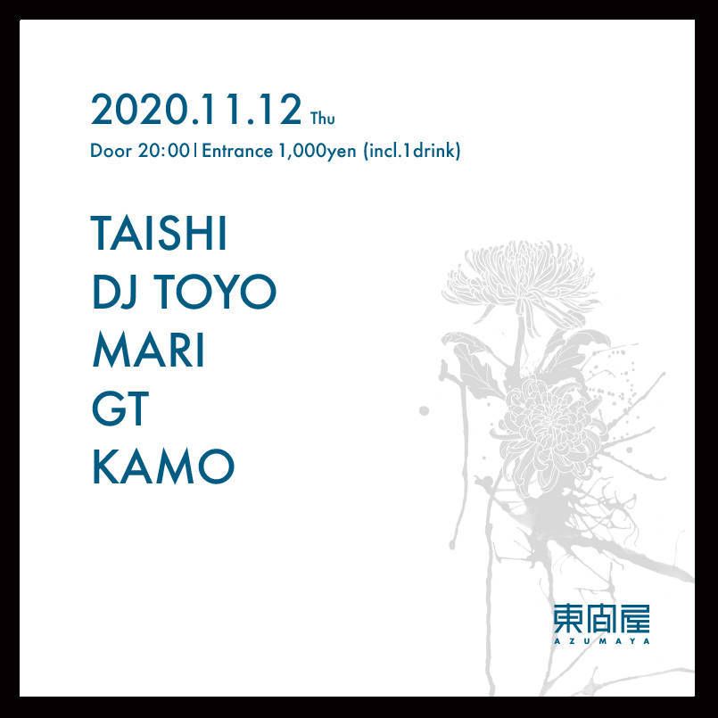 2020.11 12 NOV Azumaya -Thursday- HOUSE ROCK 0 Shares Facebook Twitter google Line DATE: 2020-11-12 THU OPEN: 20:00 VENUE: PRICE: Entrance 1,000yen(incl. 1drink) LINE UP: TAISHI DJ TOYO MARI GT KAMO