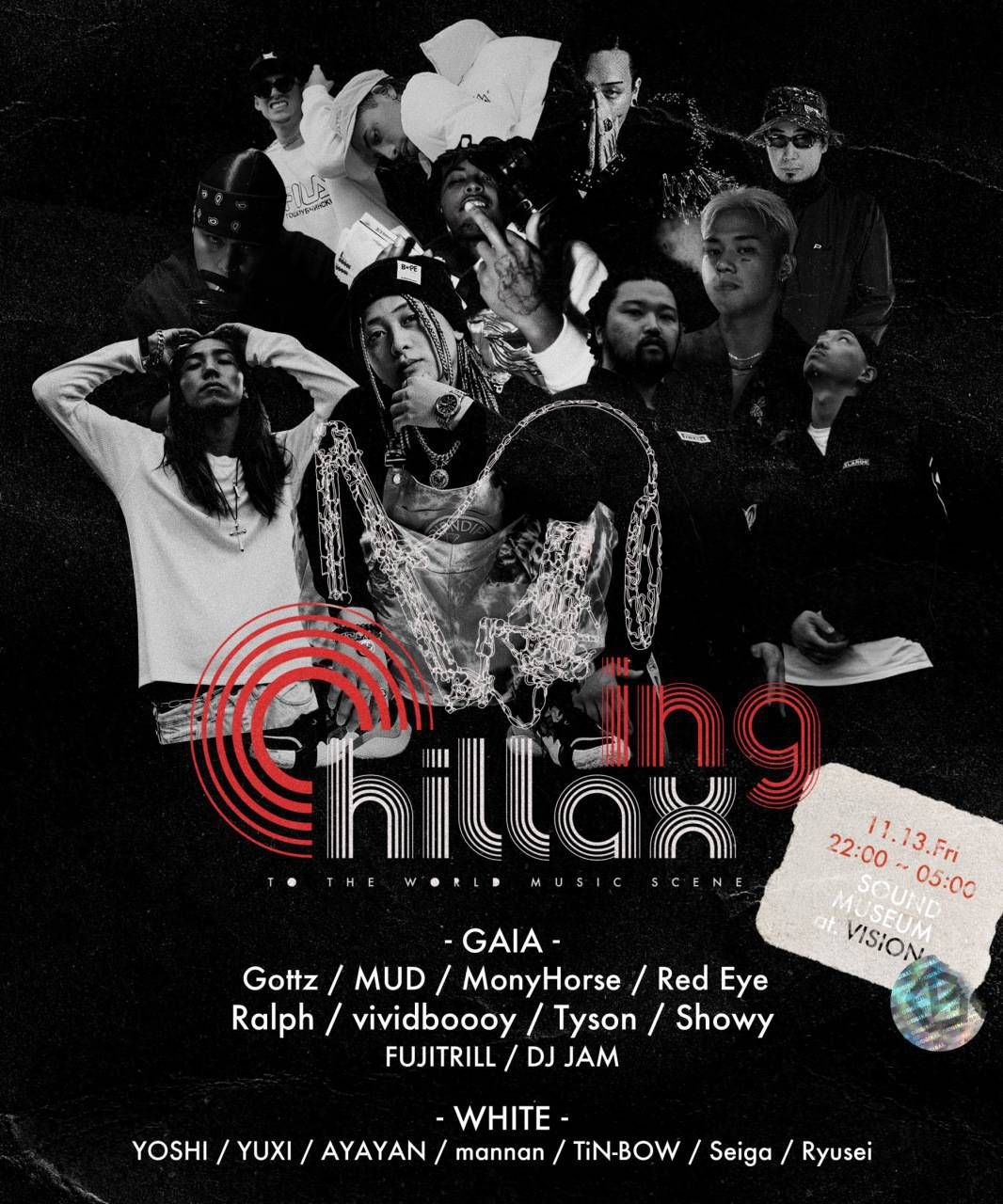 2016年からスタートした、今や日本のヒップホップシーンを牽引すると言っても過言ではないミュージックイベント「Chillaxing (チラクシング)」。東京、渋谷のクラブをはじめ、各地方の有力クラブからも多数声がかかる程の彼らのイベントは、現代の日本のヒップホップシーンに欠かせないトップアーティストはもちろん、期待度の高いアーティストらもイチ早くフックアップしていくという海外も顔負けのオーガナイズが理由だろう。またイベントに集う来場者も彼ら自体も繋がりが強い、有名なファッション関係者、モデルなども多く集うことから、毎イベントでファッションブランドなどもサポートに付き、音楽と洋服の交錯を巧みに体現している唯一無二かつ、他には真似できないビックイベントにまで急成長している。そんな彼らは今後、フェスレベルでのキャパシティを目指しての取り組みをはじめ、今まで出演してくださったアーティストや、若手を集めたアルバム、EPなども制作していくというから驚きだ。今はとにかく彼ら「Chillaxing」の動向に注目しておこう。