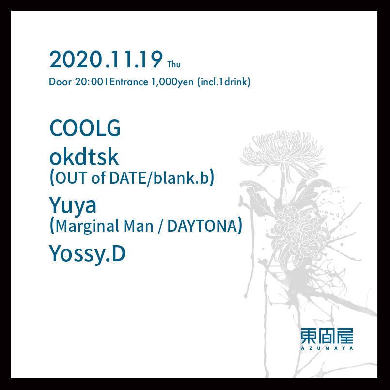 2020.11 19 NOV Azumaya -Thursday- HOUSE 0 Shares Facebook Twitter google Line DATE: 2020-11-19 THU OPEN: 20:00 VENUE: PRICE: Entrance 1,000yen(incl. 1drink) LINE UP: COOLG okdtsk (OUT of DATE / blank.) Yuya (Marginal Man / DAYTONA) Yossy.D
