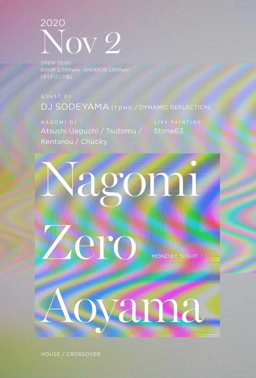 2003年、今は無き青山LOOPにて始動。 音楽とアートの融合、人と人とが繋がる空間を創り上げてきたパーティー『nagomi』 世の中がめまぐるしく変化する中、新たな歴史を刻むべく18年目に突入。 2020年最後のパーティーは、Nina Kraviz主宰レーベル「трип」を始め、数多くのレーベルからRemixワークやオリジナルトラックをリリースし、ワールドワイドに活躍するDJ SODEYAMA氏をゲストに迎える。 ハウスミュージックを主軸としたクロスオーバーなダンスミュージックと、レジデントが作り上げてきたグッドバイブスに満ち溢れたフロアーをぜひ体感して欲しい。